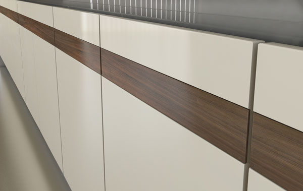 The Gevona door gives you the best of both worlds: a high gloss lacquered finish paired with your choice of a high gloss or matte veneer. It can also be paired with a glass insert. The insert is adhered to the door or drawer front for a smooth look.