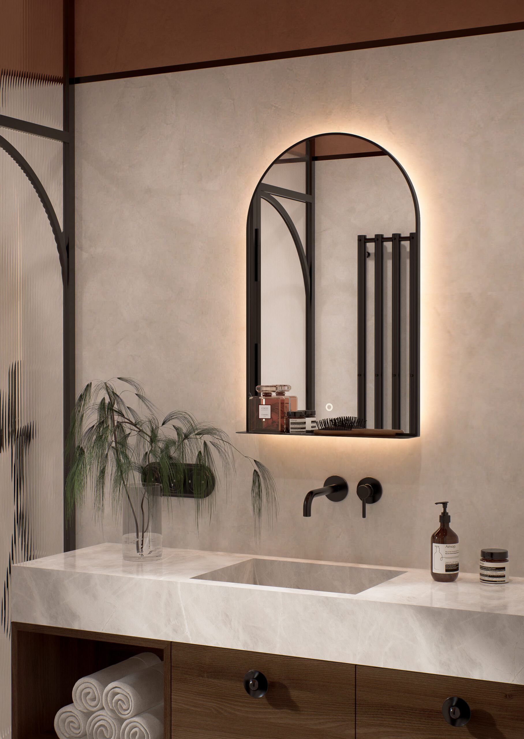 Modern and functional – that’s exactly what our mirror is. Its unique, timeless shape, practical shelf, and subtle LED lighting are sure to highlight the distinctive style of any interior, giving it a truly special character.